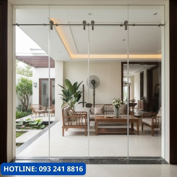 - Tối ưu hóa diện tích và mở rộng tầm nhìn: Việc sử dụng kính trong suốt giúp loại bỏ các vách ngăn che khuất tầm nhìn, mang đến cảm giác không gian nhà được mở rộng hơn rất nhiều so với thực tế. Cơ chế trượt ngang giúp giải phóng hoàn toàn diện tích mà một cánh cửa quay thường chiếm dụng, giúp bạn dễ dàng sắp xếp nội thất xung quanh lối đi mà không gặp bất kỳ trở ngại nào.