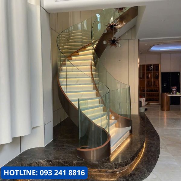 Đây là loại cầu thang sử dụng kính uốn cong tinh tế nhất, thường được đặt ở vị trí trung tâm của các căn biệt thự, penthouse hoặc sảnh lớn khách sạn.