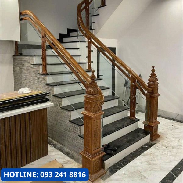 - An toàn cao: Kính cường lực 10–12 mm chịu lực tốt, khi vỡ sẽ thành hạt nhỏ không sắc nhọn. Tay vịn gỗ được gia công mịn, dễ bám, giảm nguy cơ trượt tay.